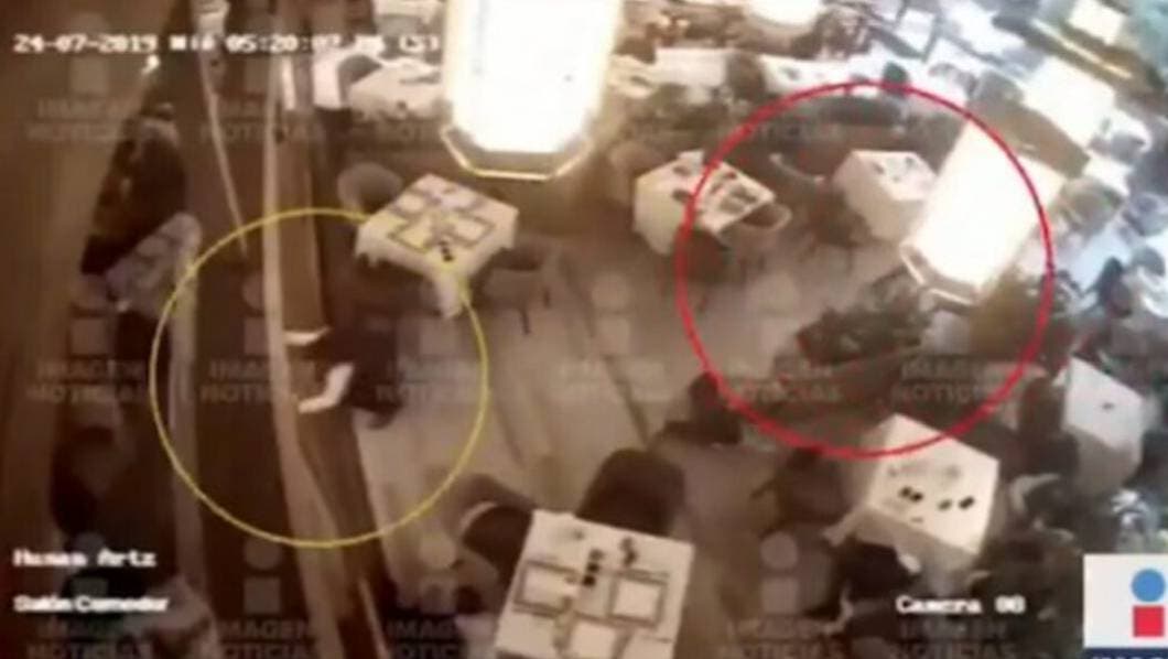 Tras los disparos, los dos hombres, con antecedentes penales tanto en México como en su país, caen al piso y el mesero y la mujer que los acompaña corren para refugiarse.
