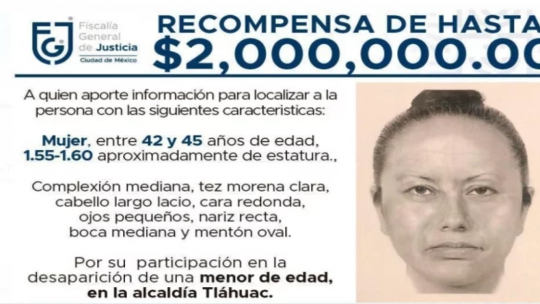 La Fiscalía informa que la indiciada tiene entre 42 y 45 años de edad, y mide aproximadamente entre 1.55 y 1.60 metros de estatura; es de complexión mediana, tez morena clara, cabello largo lacio y cara redonda.