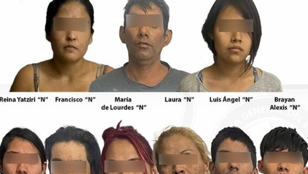 Derivado de lo anterior, se realizó la detención de Edwin Orlando “N” de 21 años, Francisco “N” de 35 años, Brayan Alexis “N” de 18 años, Luis Ángel “N” de 18 años, Laura “N” de 34 años, María de Lourdes “N” de 34 años, Reina Jatziri “N” de 20 años, así como dos adolescentes de 14 y 16 años de edad.
