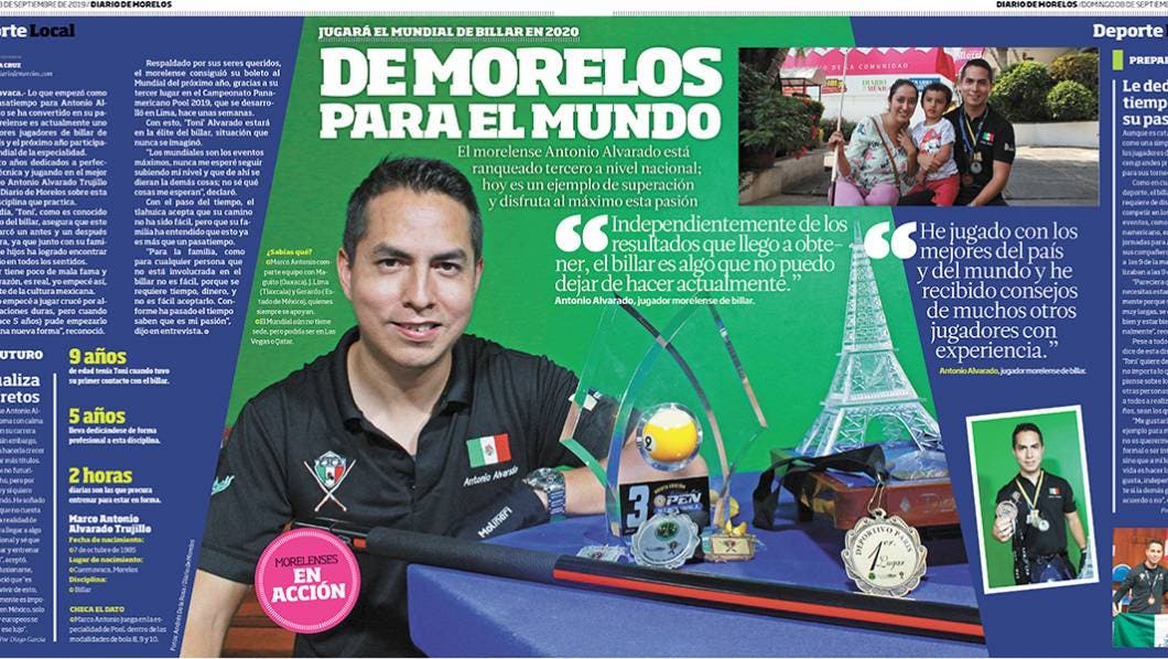 Cuernavaca.- Lo que empezó como un pasatiempo para Antonio Alvarado se ha convertido en su pasión. El morelense es actualmente uno de los mejores jugadores de billar de nuestro país y el próximo año participará en el Mundial de la especialidad.