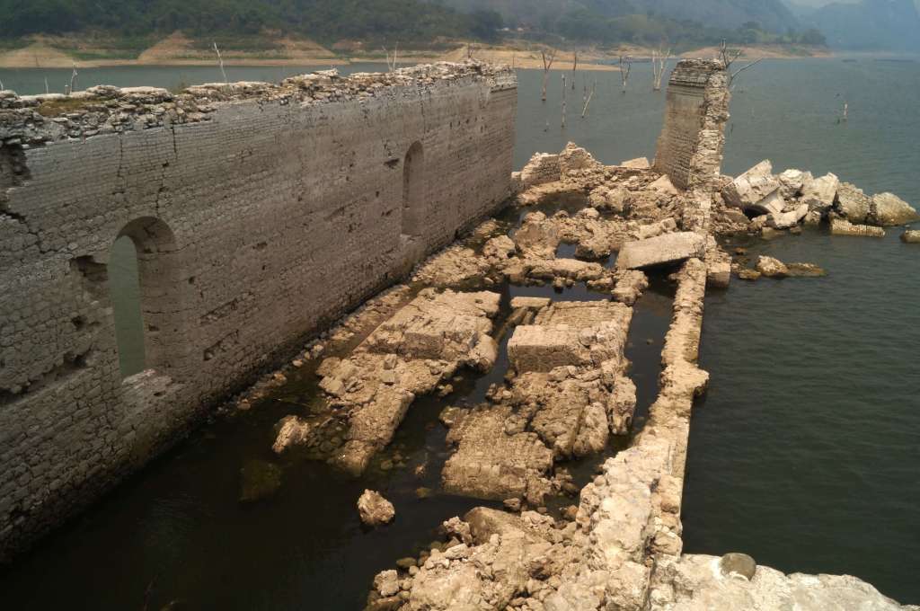 Para los pobladores de Apicpac, en Chiapas, el nivel del agua en la presa Malpaso ha disminuido como nunca antes, debido a la sequía. Y este fenómeno permite ver el antiguo Convento de Santiago Apóstol, estructura barroca del siglo XVI sumergida desde 1966. Lo que mejor se mira es la fachada, que se conserva aun cuando ha pasado décadas bajo el agua.