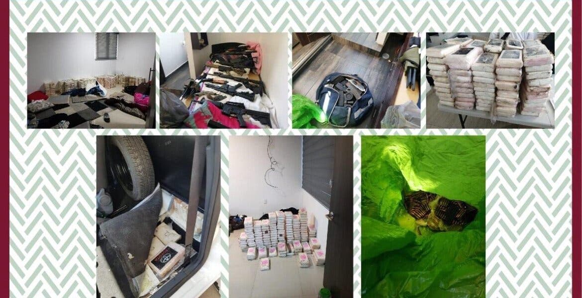 Además de los 800 paquetes de un kilogramo cada uno de cocaína, en el lugar se aseguraron 11 armas largas, cuatro armas cortas, equipos de telefonía celular, documentación diversa y tres vehículos.