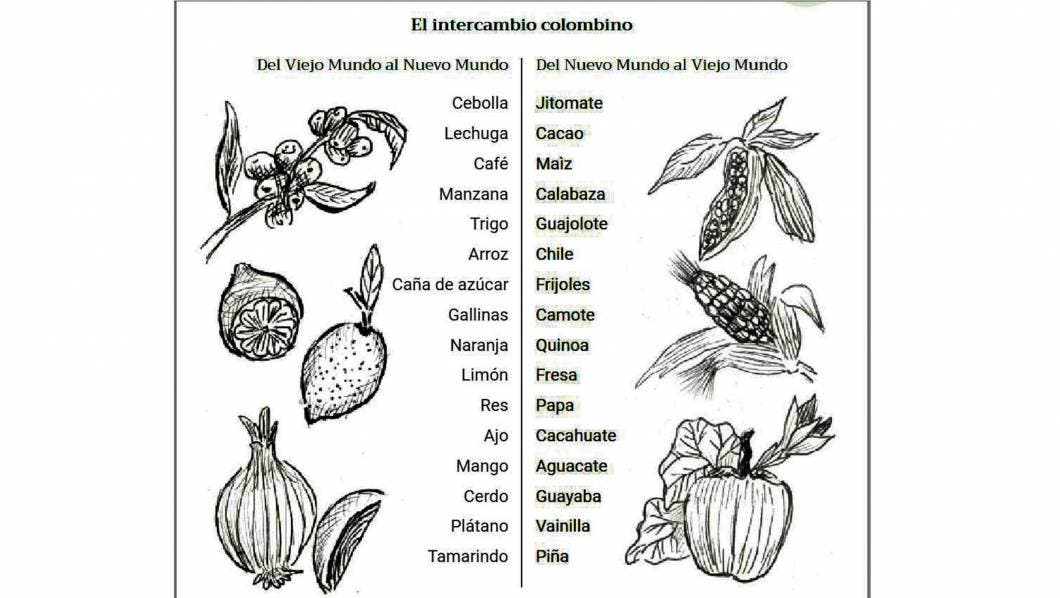 Los investigadores señalan que cebolla, lechuga, café, manzana, trigo, arroz, caña de azúcar, gallinas, naranja, limón, res, ajo, mango, cerdo, plátano y el tamarindo, están en territorio mexicano debido al intercambio que hubo durante la conquista.