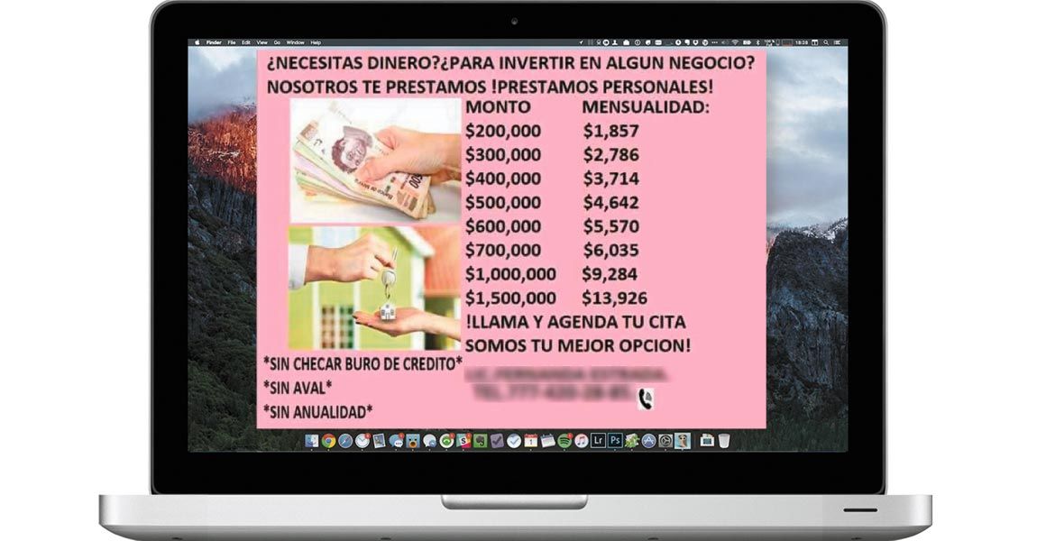 En Morelos son varias las "empresas" que ofrecen créditos con bajo interés y pagos bajos mensuales, únicamente solicitan la credencial de elector, un cobro inicial por concepto de la primera mensualidad y el seguro, el cual "es para garantizar que el cliente no se fugue con el dinero".
