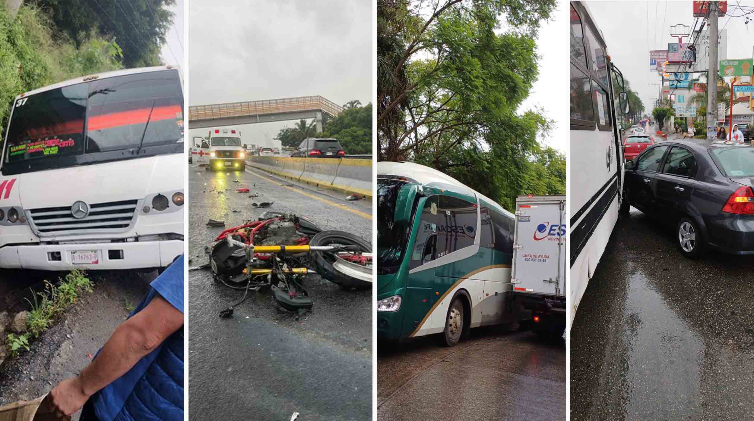 Mientras que en la avenida Plan de Ayala, de la colonia Potrero Verde, en Cuernavaca, una ruta 4 impactó a un coche Aveo gris, además, en la avenida Compositores de la colonia San Jerónimo, un autobús y un camión que transportaba abarrotes quedaron atorados al intentar pasar al mismo tiempo por la vialidad.