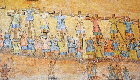 El martirio de San Felipe de Jesús, junto con otros 25 misioneros sacrificados el 5 de febrero de 1597 en Nagasaki, está plasmado en los muros de la de la nave principal de la catedral de Cuernavaca.