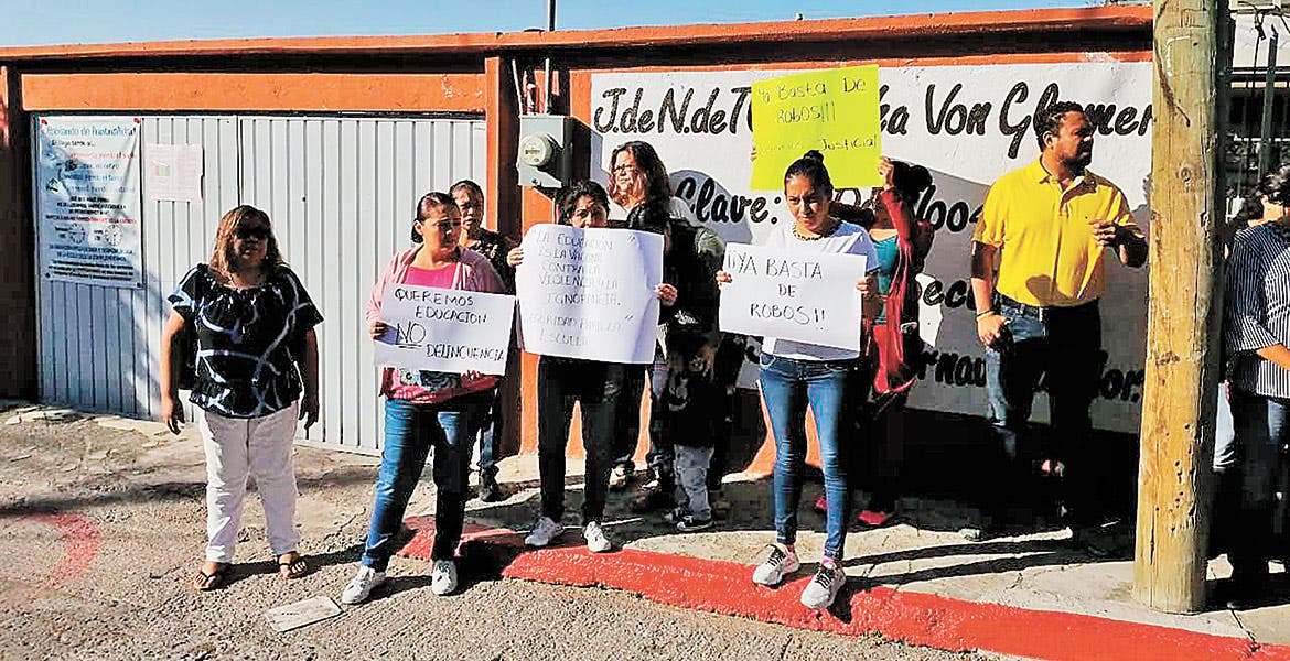 Padres de familia del jardín de niños ‘Bertha Von Glumer’, en la colonia el Empleado, en Cuernavaca, se manifestaron ayer en la entrada del edificio, para pedir ayuda, ya que denuncian que desde el 2017, van 10 robos al colegio de sus hijos.