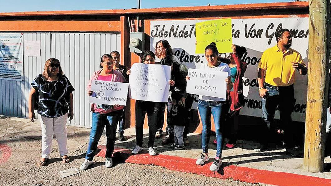 Padres de familia del jardín de niños ‘Bertha Von Glumer’, en la colonia el Empleado, en Cuernavaca, se manifestaron ayer en la entrada del edificio, para pedir ayuda, ya que denuncian que desde el 2017, van 10 robos al colegio de sus hijos.