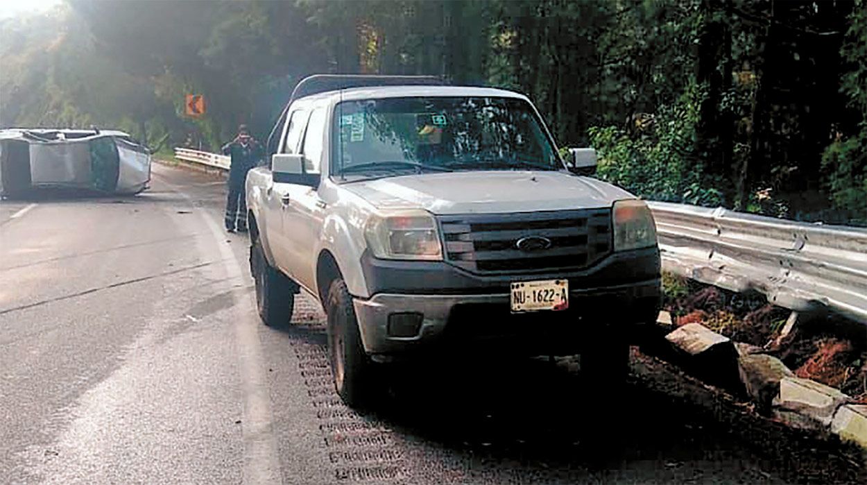 Huitzilac, MORELOS.- Tras ser chocado por una camioneta que derrapó en la Autopista México-Cuernavaca, un auto terminó volcado a la altura del poblado de Coajomulco.