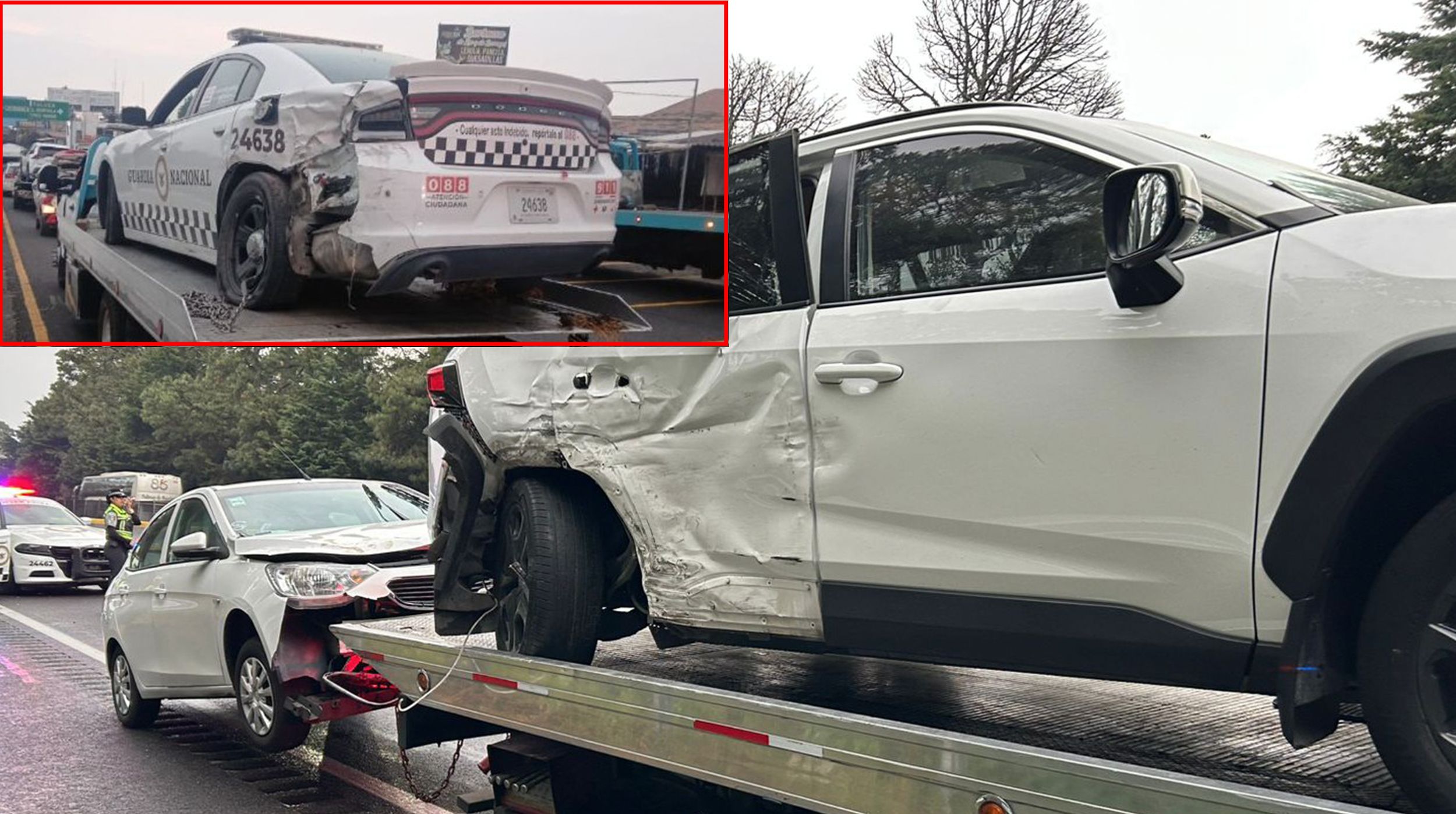 Como consecuencia de la pérdida de control, la patrulla impactó a un automóvil tipo Aveo y una camioneta marca Toyota, ambos de color blanco. El choque proyectó a las unidades hacia el acotamiento, lo que generó tráfico lento en la zona por algunos minutos mientras arribaban los cuerpos de emergencia.