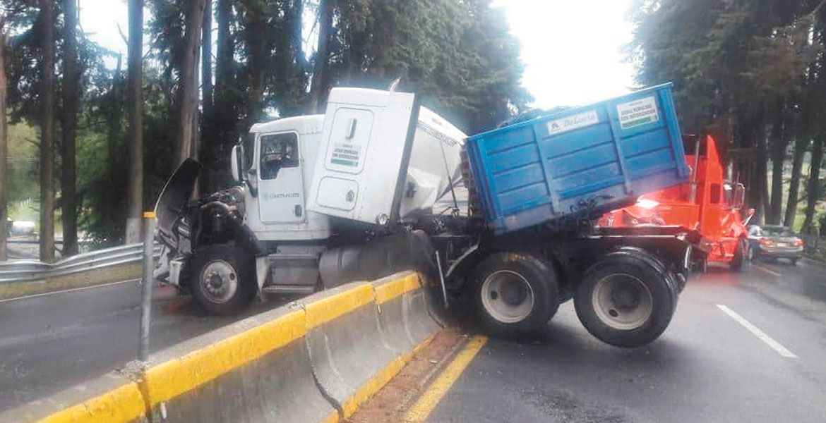 Huitzilac, MORELOS.- Un tráiler quedó encima de los muros de contención que dividen la autopista México-Cuernavaca, a la altura del poblado de Tres Marías, en Huitzilac, luego de que el chofer perdiera el control al derrapar.