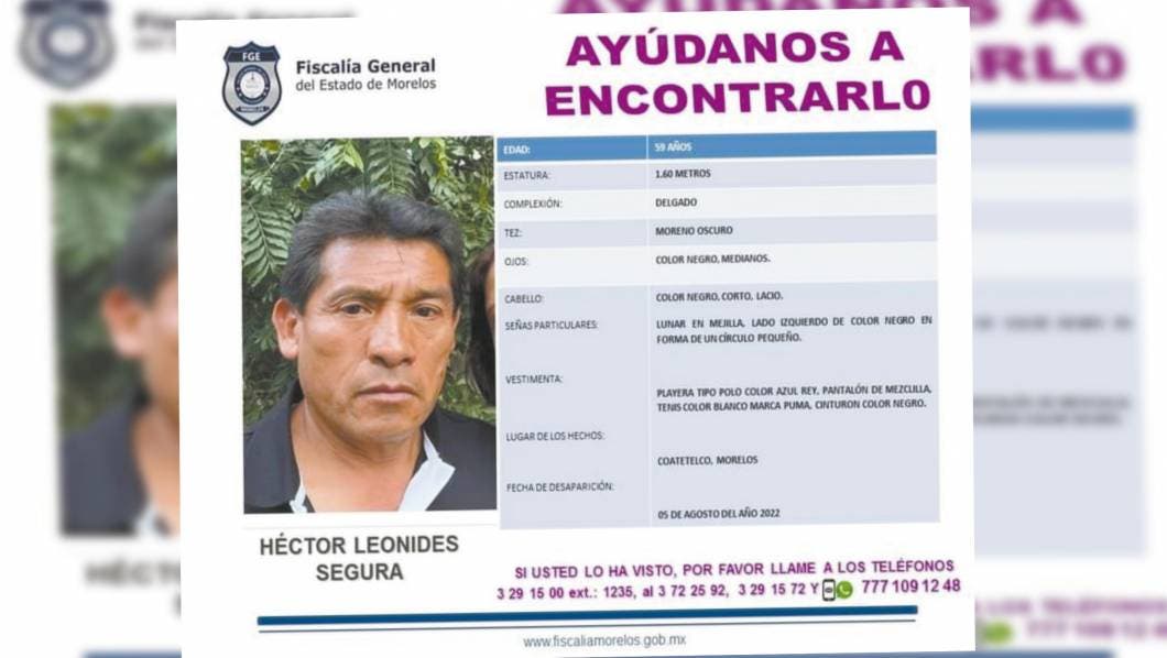 Se trata de Héctor Leonides Segura, de 59 años, quien fue visto por última vez el pasado 5 de agosto y es identificado como hermano de Humberto Leonides Segura, primer alcalde de Coatetelco.