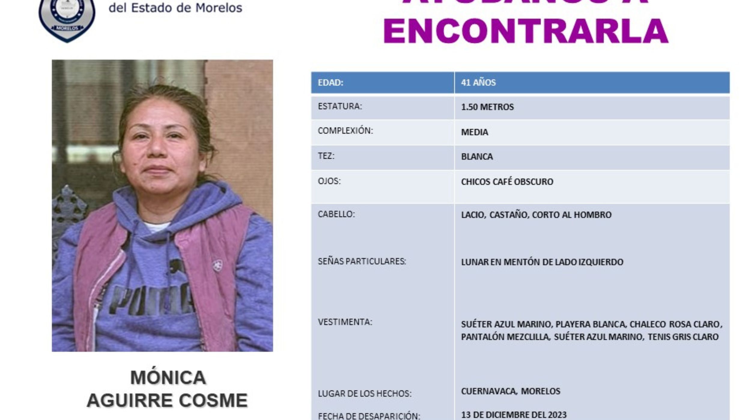 Autoridades emitieron una ficha para la búsqueda de Mónica Aguirre Cosme, de 41 años, quien desapareció desde el 13 de diciembre en Cuernavaca.