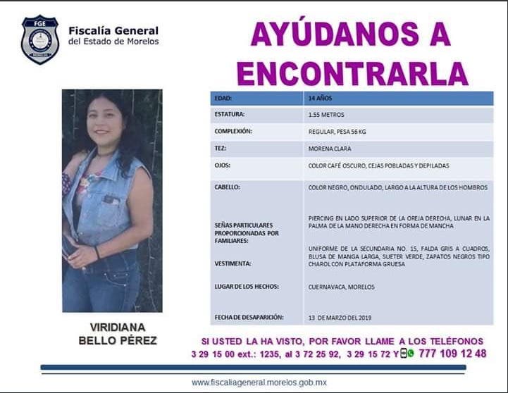 Viridiana tiene 14 años, de estatura 1.55 metros, complexión regular, tez morena, ojos café oscuro y cabello negro.