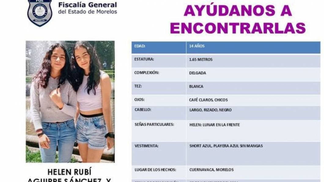 Autoridades de la Fiscalía Morelos solicitan la colaboración de la ciudadanía para localizar a dos hermanas de 14 años, las cuales se encuentran desaparecidas, tras ser vistas por última vez en Cuernavaca el 7 de noviembre.