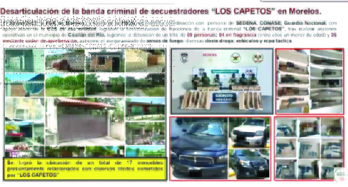 - En un comunicado emitido por la Fiscalía General del Estado de Morelos, se informa de la desarticulación de la banda denominada "Los Capetos" que operaba en el estado.