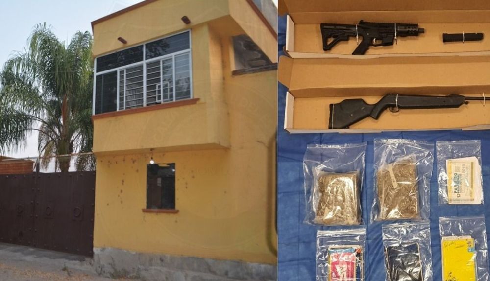 En la propiedad se realizó además el aseguramiento de aproximadamente dos kilos de vegetal verde, un rifle de diábolos calibre 5.5 mm, una camioneta marca Chevrolet de color rojo con placas de circulación MYT-1731 del Estado de México, una camioneta marca Ford tipo Ranger de color gris sin placas de circulación y una camioneta Chevrolet tipo Captiva con placas de circulación del Estado de Morelos, así como cinco equipos de telefonía móvil y diversos documentos.