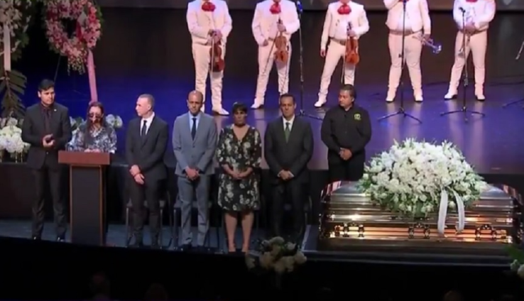 En el fondo del escenario se apreció una fotografía de gran formato del intérprete de ‘Payaso’, asimismo se encontraba el féretro dorado con un arreglo floral encima, así como coronas fúnebres a los lados.
