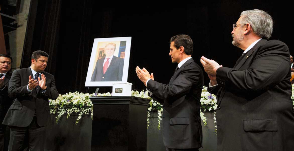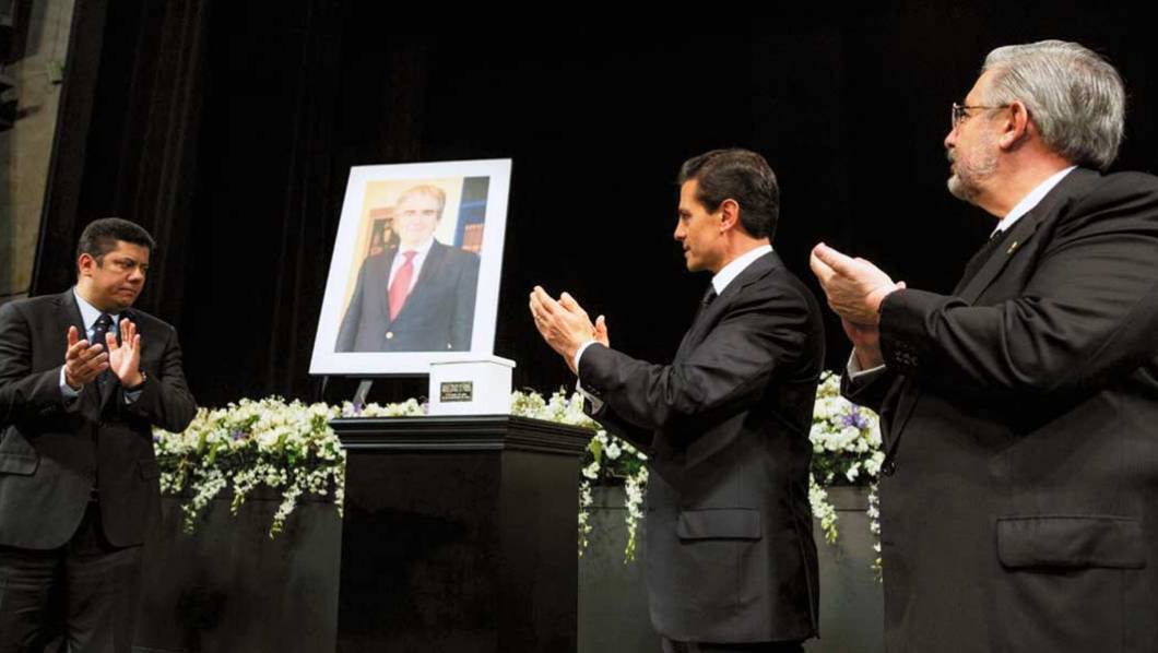 El diputado Javier Bolaños, presidente del Congreso de la Unión, en las exequias de Rafael Tovar y de Teresa, quien fuera secretario de Cultura, en compañía del Presidente de la República, Enrique Peña Nieto, y el presidente de la Suprema Corte, Luis María Aguilar.
