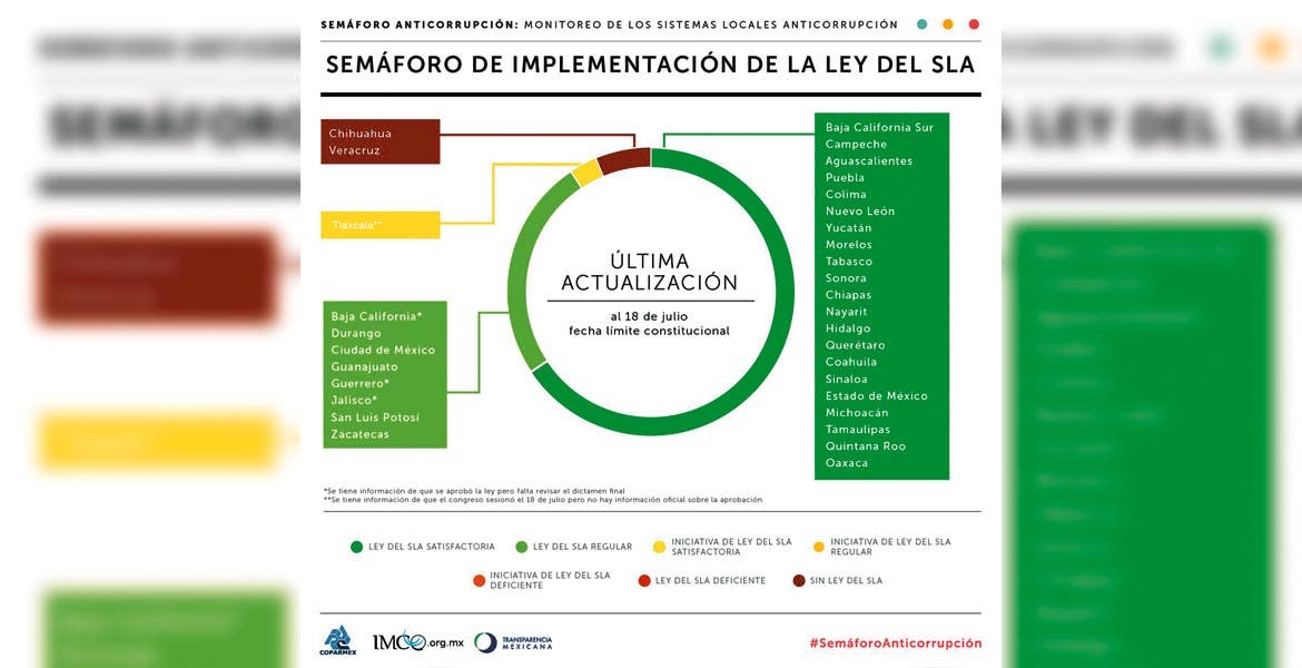Lo anterior, de acuerdo con el Semáforo de la reforma constitucional y con el Semáforo de implementación de la Ley del Sistema Local Anticorrupción, que el IMCO, en coordinación con Coparmex y Transparencia Mexicana, pusieron en marcha el pasado 28 de febrero para dar seguimiento al tema.