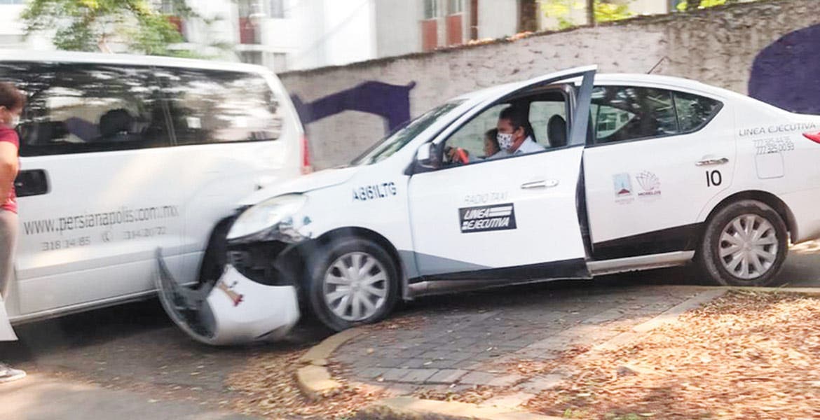 Un taxi Nissan-Versa, del sitio “Línea Ejecutiva”, terminó con el cofre destrozado, tras ser impactado por una camioneta blanca que hizo corte de circulación sin precaución para dar vuelta en un retorno de la avenida Díaz Ordaz, de la colonia Cantarranas, en Cuernavaca.