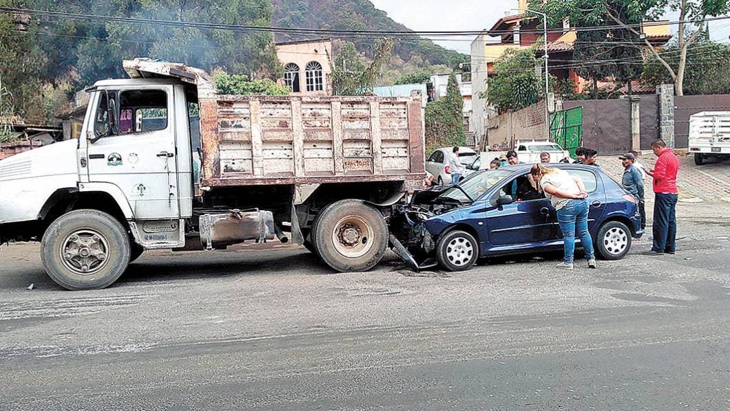 Un auto Peugeot, color azul, terminó con el frente destrozado, luego de que su conductora no guardara su distancia y se impactara contra un camión de volteo, al pasar por un tope en la carretera federal Tepoztlán-Cuernavaca, a la altura de la colonia Rodolfo López de Nava, en Cuernavaca.