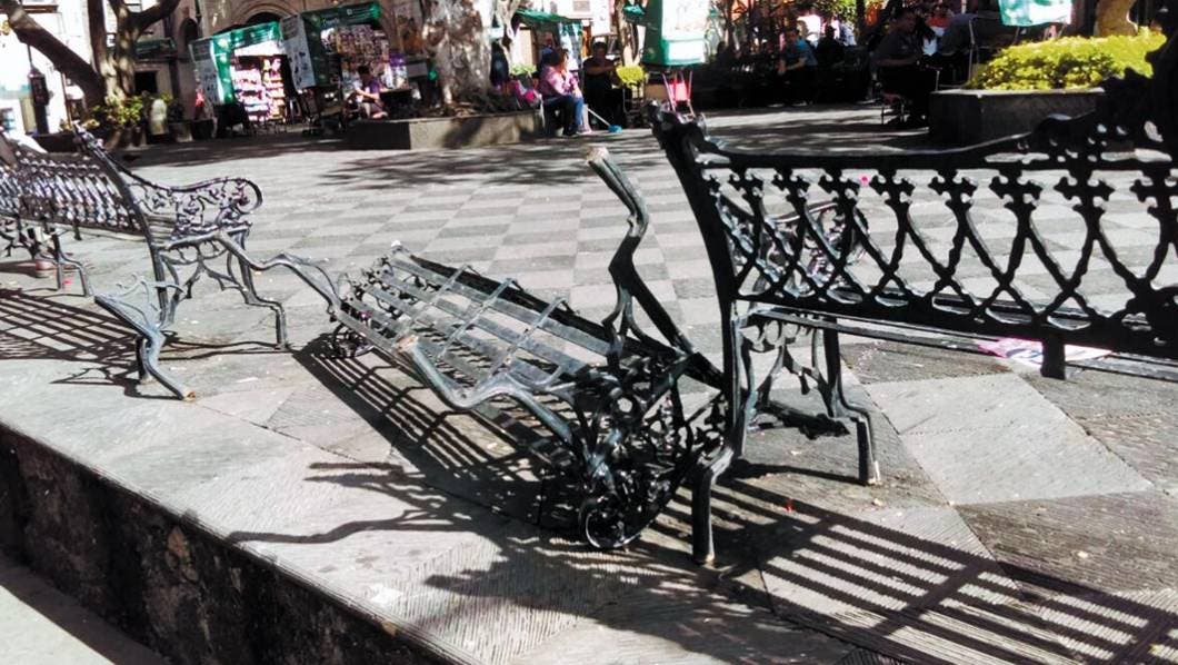 Increíblemente, una banca ubicada en el Jardín Juárez, en pleno Centro Histórico de Cuernavaca amaneció ayer destrozada.