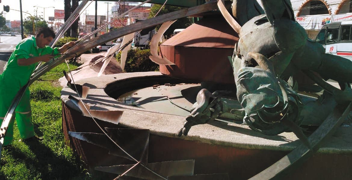 Un accidente vehicular la madrugada del sábado terminó por destruir “El carro del Sol”, de por sí deteriorada escultura; trabajadores de la Secretaría de Obras del Ayuntamiento levantaron la tarde de ayer en pedazos la obra de Miriam Pérez.
