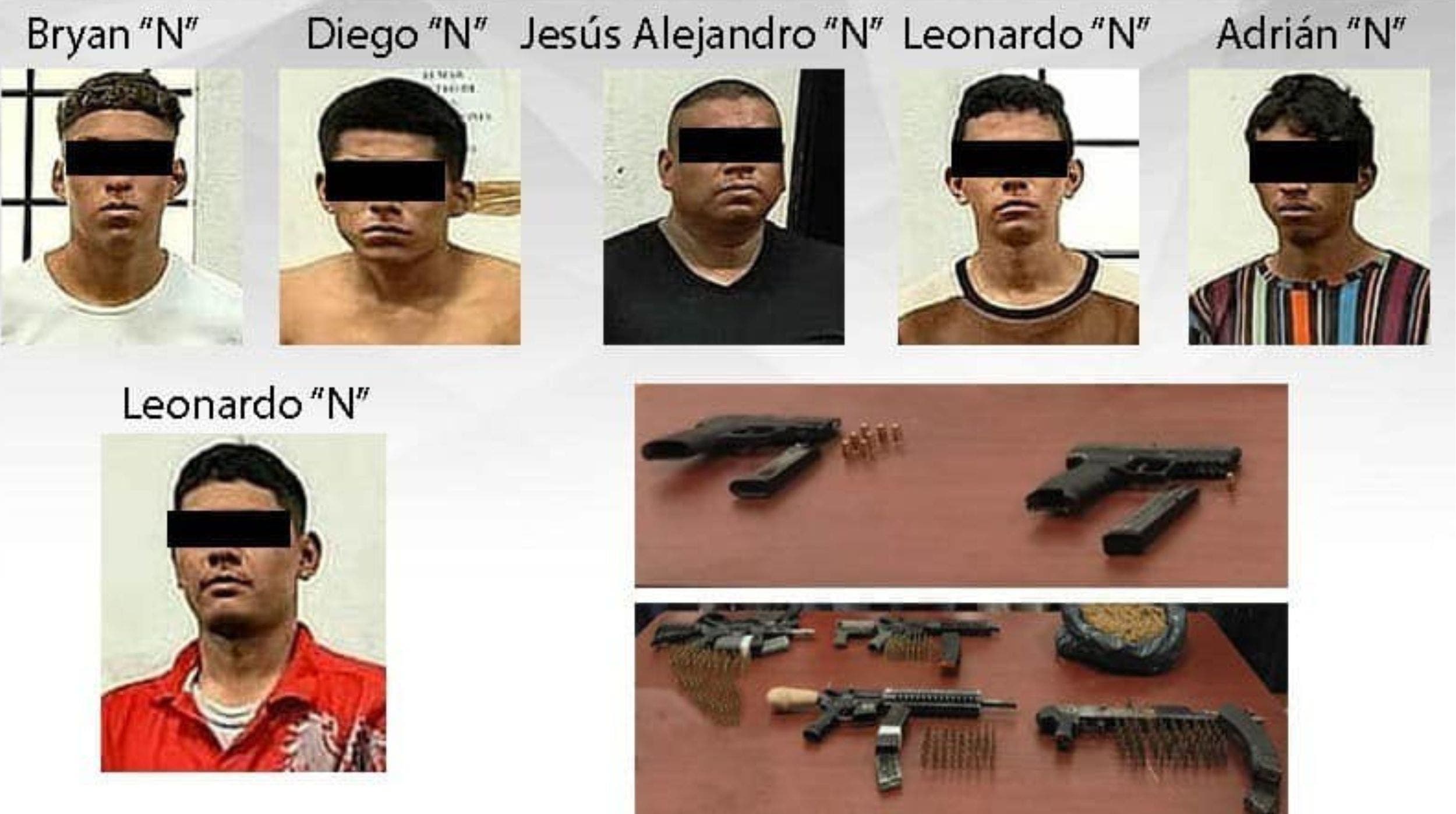 Así como Bryan “N”, de 18 años; Diego “N”, de 21; Jesús Alejandro “N”, de 33; Leonardo “N”, de 18; Adrián “N”, de 21; y Leonardo “N”, de 25 años de edad; quienes fueron presentados ante el agente del Ministerio Público para que determine su situación jurídica.