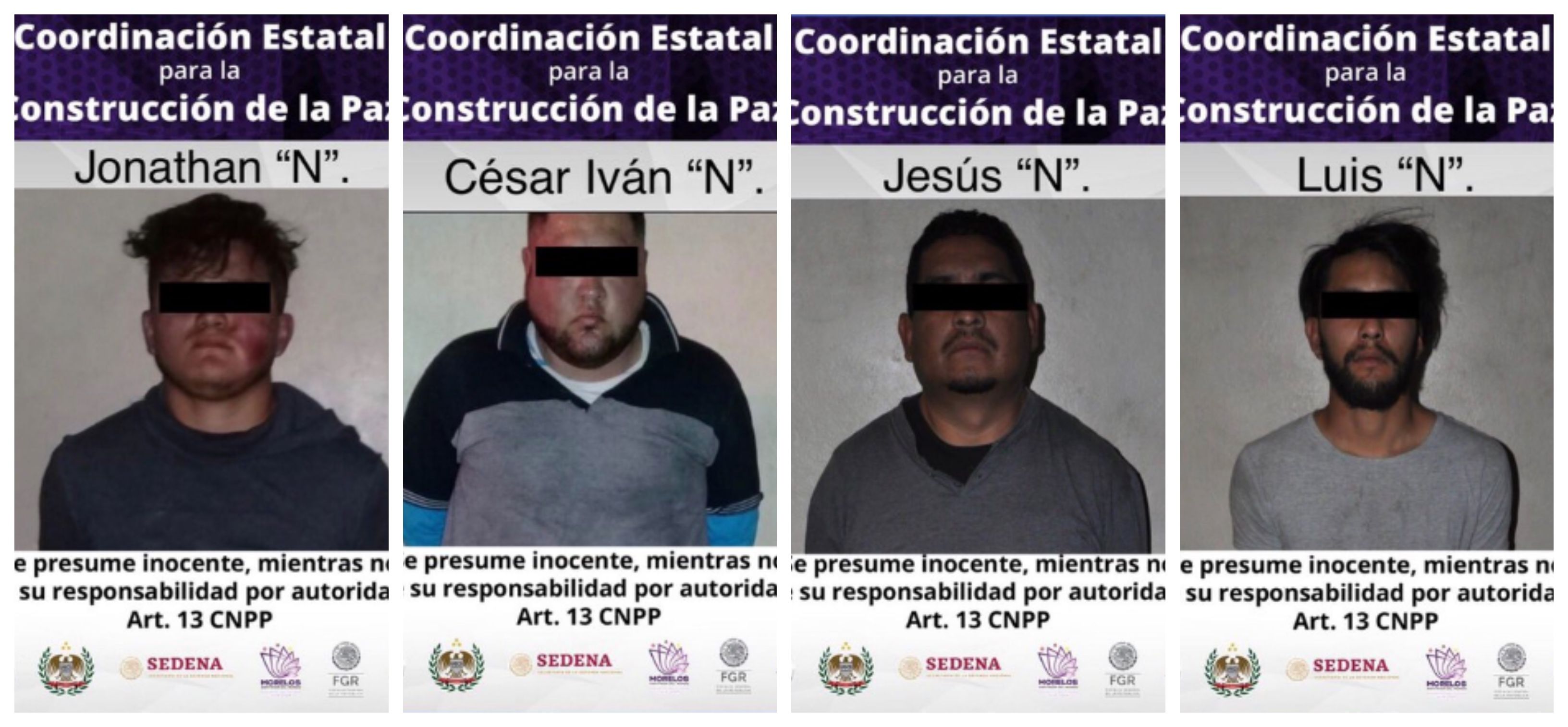 Por estos hechos se puso a disposición de la autoridad competente por el delito de robo calificado a quienes dijeron llamarse Cesar Iván “N”, de 28 años; Jonathan “N”, de 22 años; Jesús “N”, de 41 años; Luis “N”, de 27 años; José Armando “N”, de 38 años; Ana “N”, de 25 años; Fernando “N”, de 57 años; Marcelino “N”, de 49 años; y Yair Aciel “N”, de 27 años de edad.