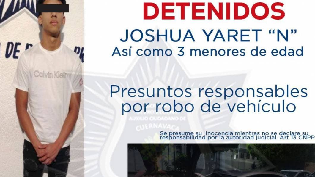 Los detenidos son Joshua Yaret "N” de 19 años con domicilio en Cuernavaca, así como tres adolescentes, Patricio Joxan “N”, Diego “N” y Ángel Yahir “N”, quienes presuntamente forman parte de una banda dedicada al robo de vehículos en colonias colindantes de Cuernavaca y Jiutepec, hechos que han sido ampliamente difundidos a través de las redes sociales; se presume son los integrantes de la denominada banda "del Enjambre".