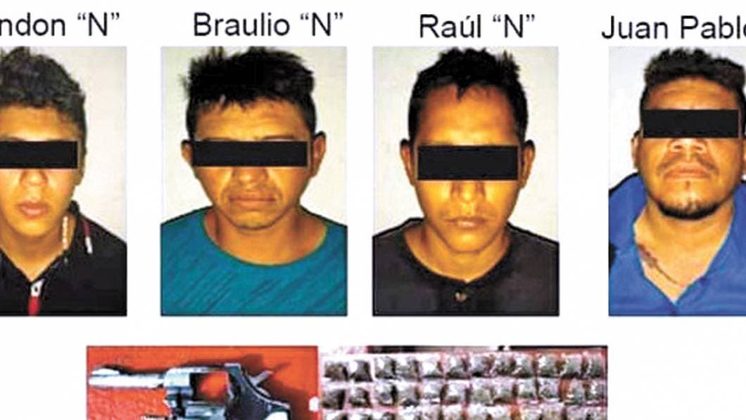 Los detenidos son Brandon Fernando, de 18 años, quien portaba un revólver calibre .22; Braulio, de 34; Raúl, de 31; y Juan Pablo, de 35, los cuales fueron puestos a disposición del Ministerio Público por su posible participación en delitos contra la salud.