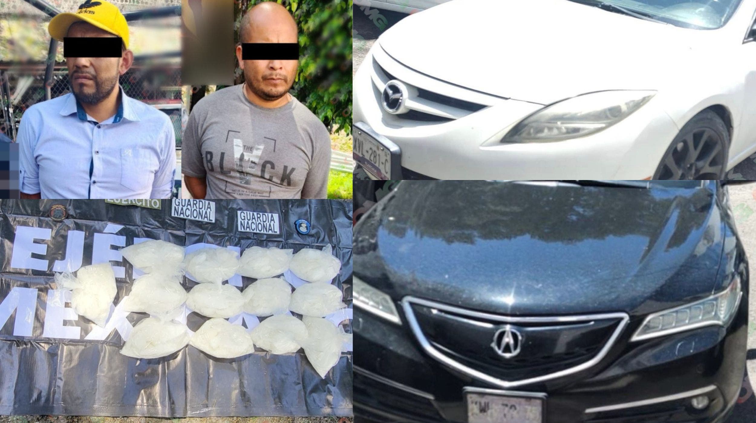 Al inspeccionar un Acura negro con placas XWH-75-79 y un Mazda blanco con placas XVL-281-C, ambos del estado de Tlaxcala, las autoridades hallaron en el primero una caja con 13 bolsas conteniendo aproximadamente un kilo de sustancia similar al cristal cada una.