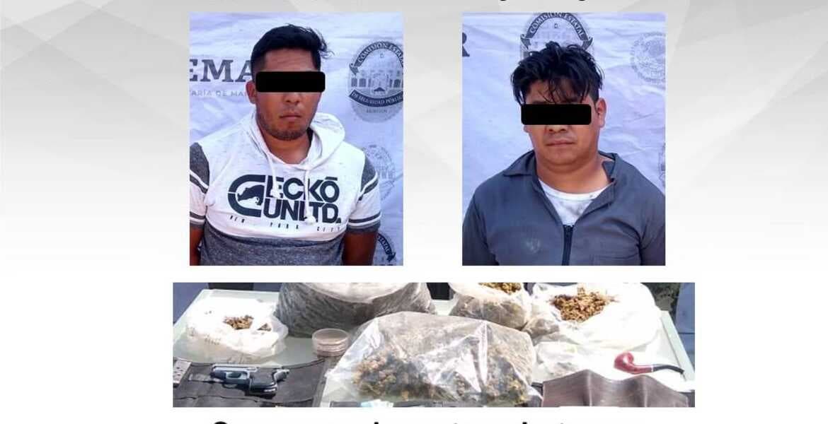 En el lugar, detuvieron a Miguel Ángel "N" de 30 años y a Víctor Manuel "N" de 29 años de edad, a quienes se les aseguró un arma de fuego con un cargador abastecido con cartuchos útiles y varias bolsas de plástico con vegetal verde con las características similares a la marihuana.