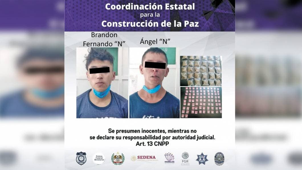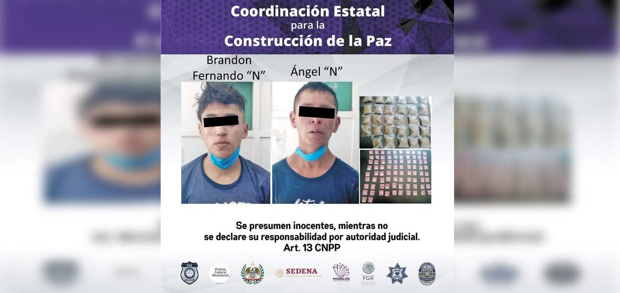 Ángel, de 29 años; y Brandon, de 19, quedaron a disposición del Ministerio Público por delitos contra la salud y lo que resulte luego de que los aseguraron elementos de la Policía Morelos.