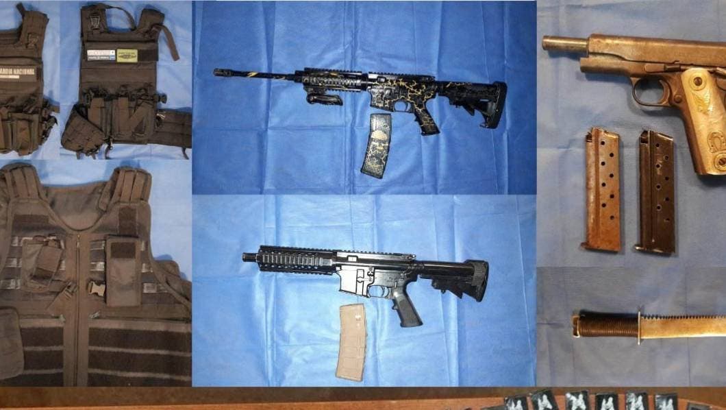 Con motivo de la investigación se obtuvo y ejecutó una diligencia de cateo en el domicilio de donde salieron los hoy detenidos, en donde se logró el aseguramiento de tres vehículos; dos de ellos con reporte de robo vigente, tres chalecos tácticos; dos de ellos con logos oficiales de la Guardia Nacional y Policía Federal, 26 cartuchos balísticos, diversa documentación y 15 teléfonos celulares. Además de las tres armas de fuego; dos largas y una corta, una navaja metálica, y 27.91 gramos de metanfetamina distribuida en 144 bolsas pequeñas resellables con la imagen característica del grupo denominado “El Señorón”.