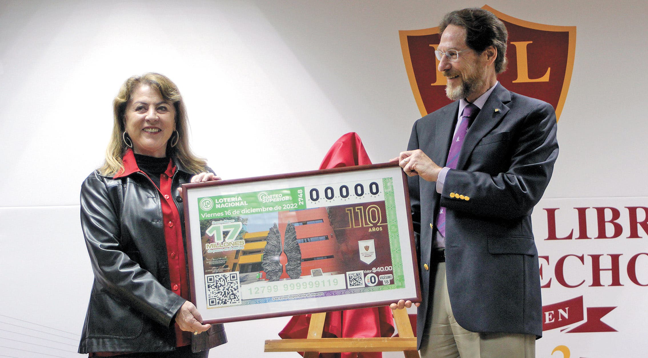CUERNAVACA, MORELOS.- Lotería Nacional develó el billete del Sorteo Superior No. 2748 alusivo al 110° Aniversario de la Escuela Libre de Derecho, que da testimonio del ejercicio docente de la institución más longeva en la profesionalización jurídica, cuenta con uno de los más estrictos métodos pedagógicos formando profesionistas capaces al servicio del país.