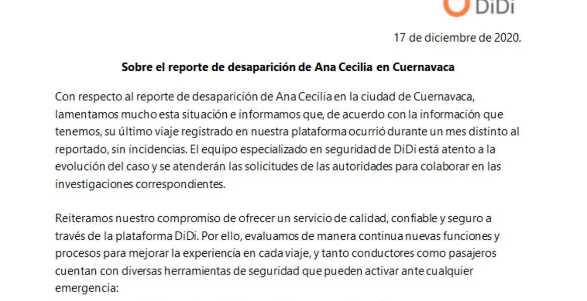 En el boletín, se indica que "con respecto al reporte de desaparición de Ana Cecilia en la ciudad de Cuernavaca, lamentamos mucho esta situación e informamos que, de acuerdo con la información que tenemos, su último viaje registrado en nuestra plataforma ocurrió durante un mes distinto al reportado, sin incidencias. El equipo especializado en seguridad de DiDi está atento a la evolución del caso y se atenderán las solicitudes de las autoridades para colaborar en las investigaciones correspondientes."
