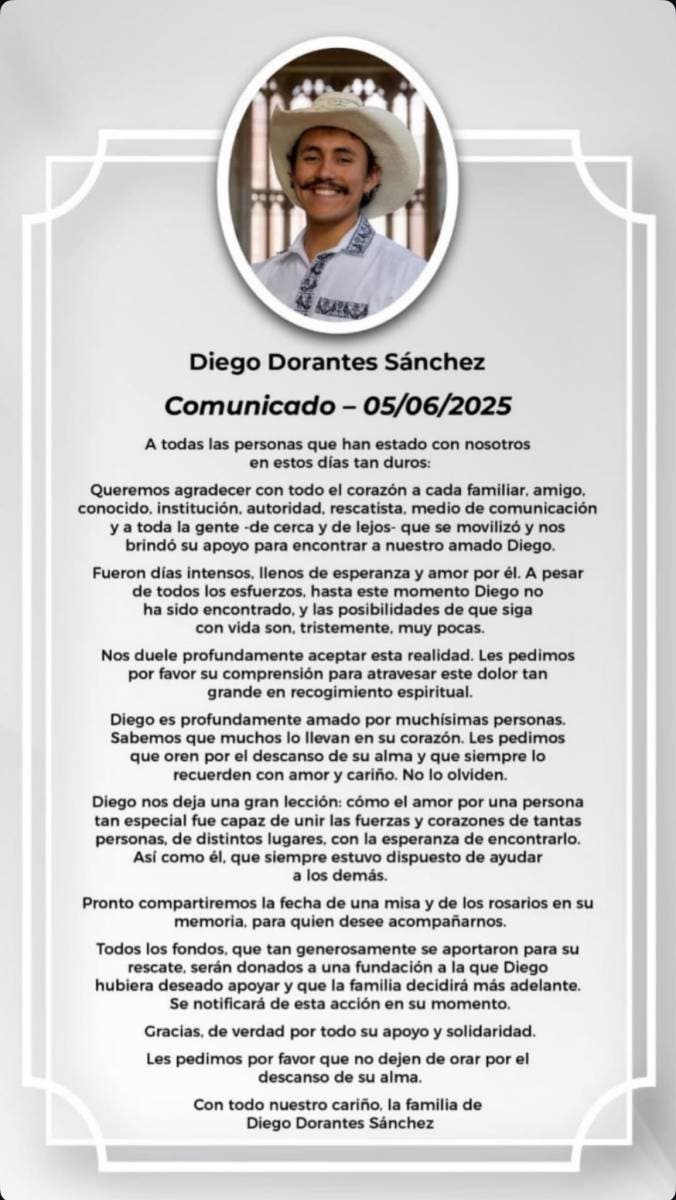 “Queremos agradecer con todo el corazón a cada familiar, amigo, conocido, institución, autoridad, rescatista, medio de comunicación y a toda la gente -de cerca y de lejos- que se movilizó y nos brindó su apoyo para encontrar a nuestro amado Diego”, expresaron.