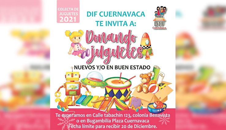 Cuernavaca.- El DIF Cuernavaca invita a la población a poner su granito de arena con la donación de juguetes nuevos o usados, en buenas condiciones, para que las niñas y niños que se encuentran en colonias vulnerables puedan recibir un juguete. El último día para recibir los juguetes es el día 20 de diciembre.