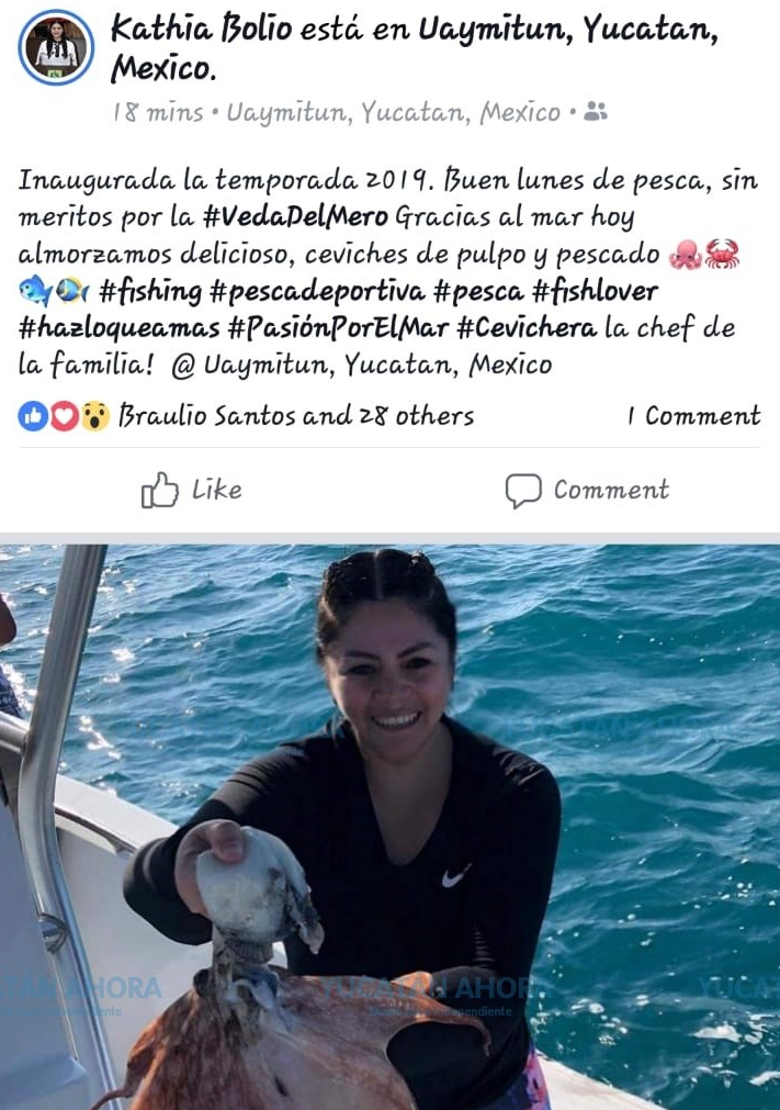 A unas horas de que entró en vigor la veda del mero, la diputada panista Kathia Bolio Pinelo presumió en redes sociales un día de pesca que tuvo en Uaymitún, y aunque su intención era promover la campaña de apoyo a los pescadores, le salió contraproducente, porque en las fotos que compartió se le ve sacando un pulpo, especie actualmente en veda.