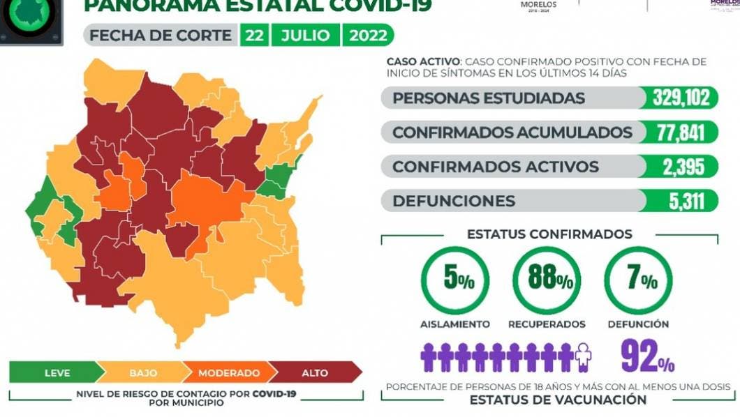 La Secretaría de Salud informa que a la fecha en Morelos se han estudiado 329 mil 102 personas, de las cuales se han confirmado 77 mil 841 con coronavirus COVID-19; 2 mil 395 están activas y se han registrado 5 mil 311 defunciones.