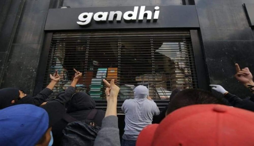 A través de redes sociales circulan las imágenes de los momentos en el que grupos de jóvenes encapuchados lanzan materiales y queman la librería con el grito: