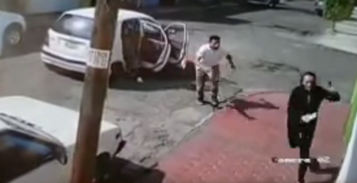 En una cinta que circula en redes sociales, se ve el momento en que un par de sujetos bajan rápidamente de un vehículo color blanco, justo donde la víctima se hallaba parada.