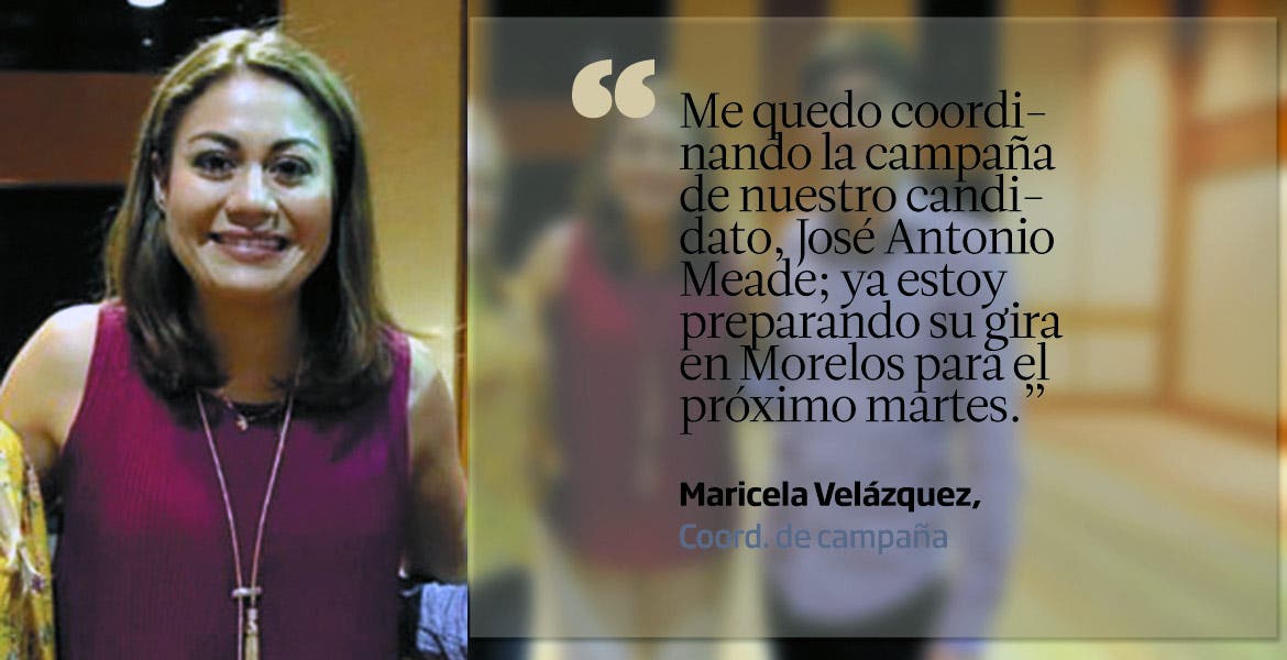Me quedo coordinando la campaña de nuestro candidato, José Antonio Meade; ya estoy preparando su gira en Morelos para el próximo martes." Maricela Velázquez, Coord. de campaña