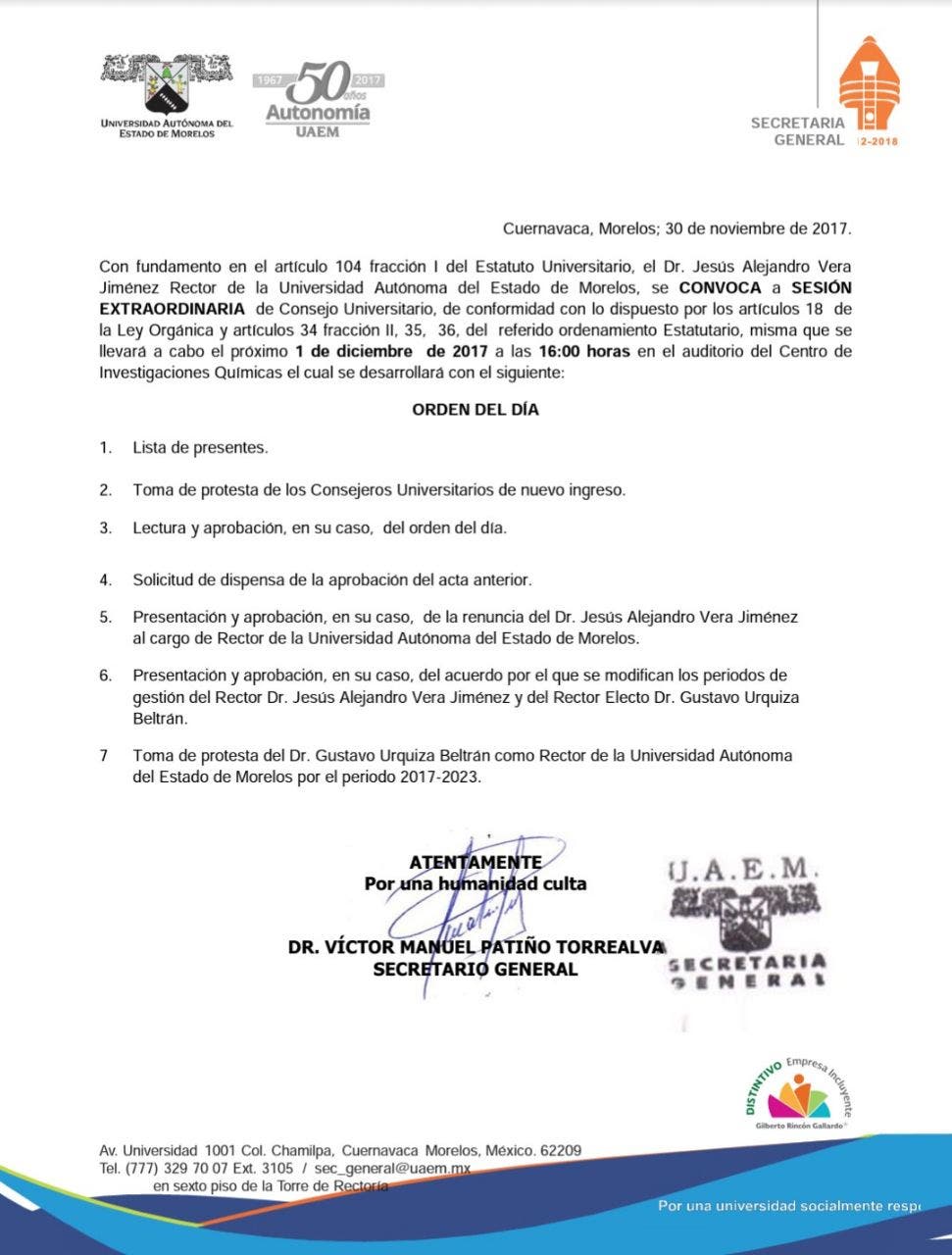 El Consejo Universitario tomará mañana la protesta de ley a Gustavo Urquiza Beltrán como nuevo rector de la UAEM, ante la renuncia que presentará Alejandro Vera Jiménez al cargo, para lo cual convocó a sesión extraordinaria para las 16:00 horas de este viernes 1 de diciembre