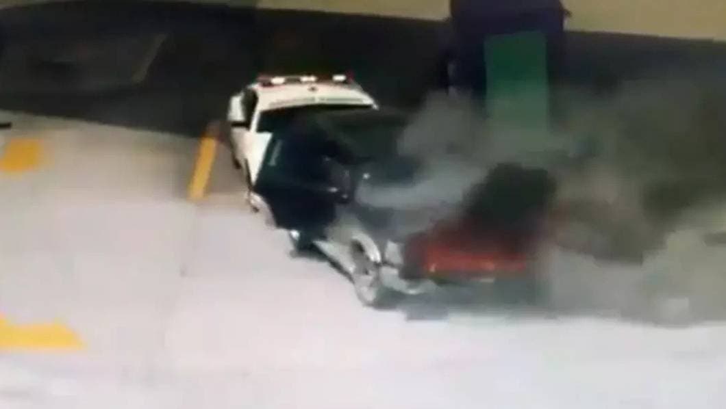Las cámaras de videovigilancia captaron el momento en que la patrulla de la Guardia Nacional empuja de la parte trasera la camioneta negra que emite fuego por su cofre, y que estaba justo al lado de varias bombas de distribución de combustible. Con delicadeza, la patrulla 18944 empujó la camioneta y evitó un desastre en Tlaxcala, sin que se sepa el municipio.