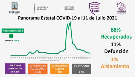 Cuernavaca, Morelos.- La Secretaría de Salud confirmó que a la fecha en Morelos se han estudiado 168 mil 279 personas, de las cuales se han confirmado 35 mil 426 con Coronavirus; 210 están activas y se han registrado 3 mil 781 defunciones.