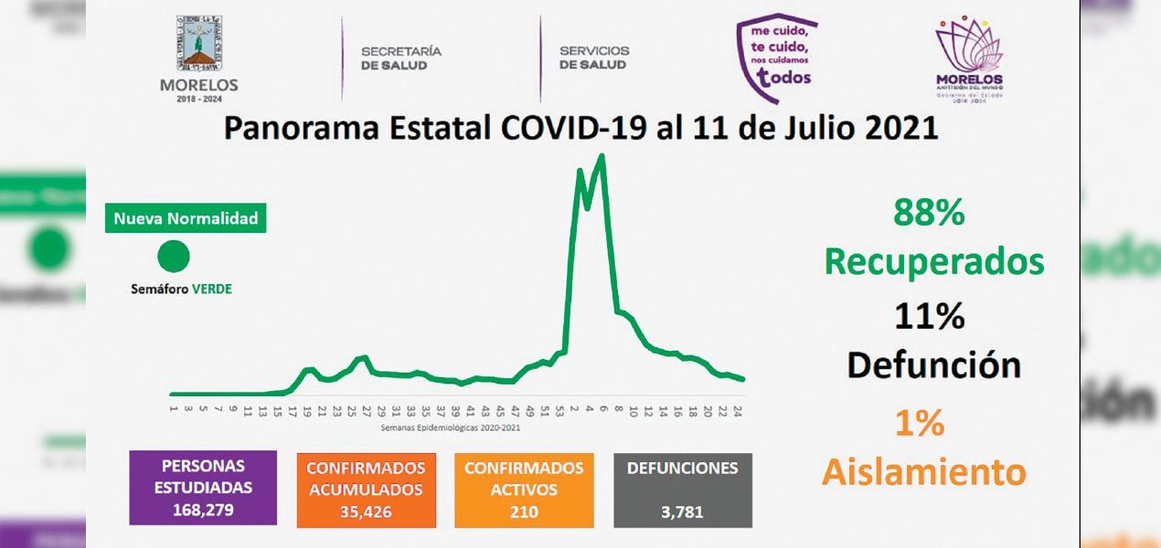 Cuernavaca, Morelos.- La Secretaría de Salud confirmó que a la fecha en Morelos se han estudiado 168 mil 279 personas, de las cuales se han confirmado 35 mil 426 con Coronavirus; 210 están activas y se han registrado 3 mil 781 defunciones.