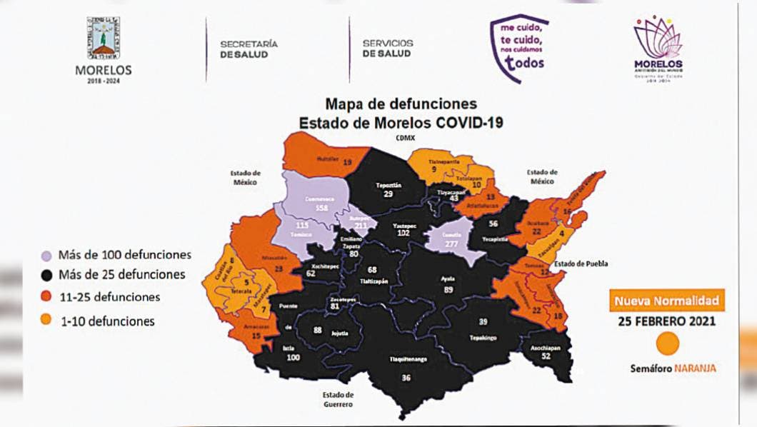 Se reportaron 29 defunciones en Cuautla, Cuernavaca, Emiliano Zapata, Huitzilac, Jantetelco, Jiutepec, Jojutla, Jonacatepec, Puente de Ixtla, Temixco, Tlaltizapán, Tlaquiltenango, con enfermedades como diabetes, hipertensión, insuficiencia renal crónica, obesidad y otras comorbilidades.